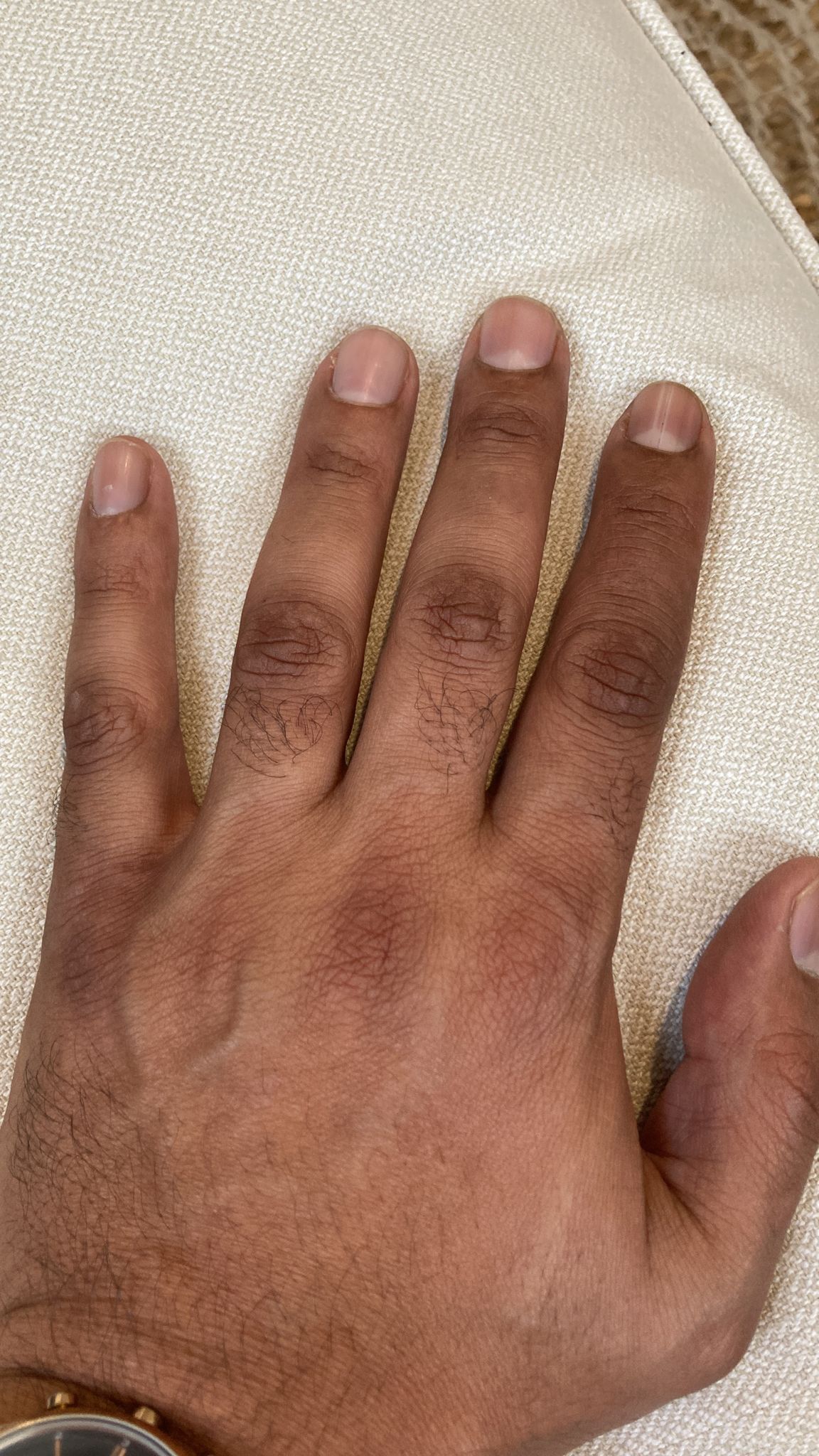 2 כפות הידיים שלו מכוסות כתמים לבנים מתקלפים וסדוקים מה שמפריע לו מאוד בכל פעולה בסיסית שהוא עושה.